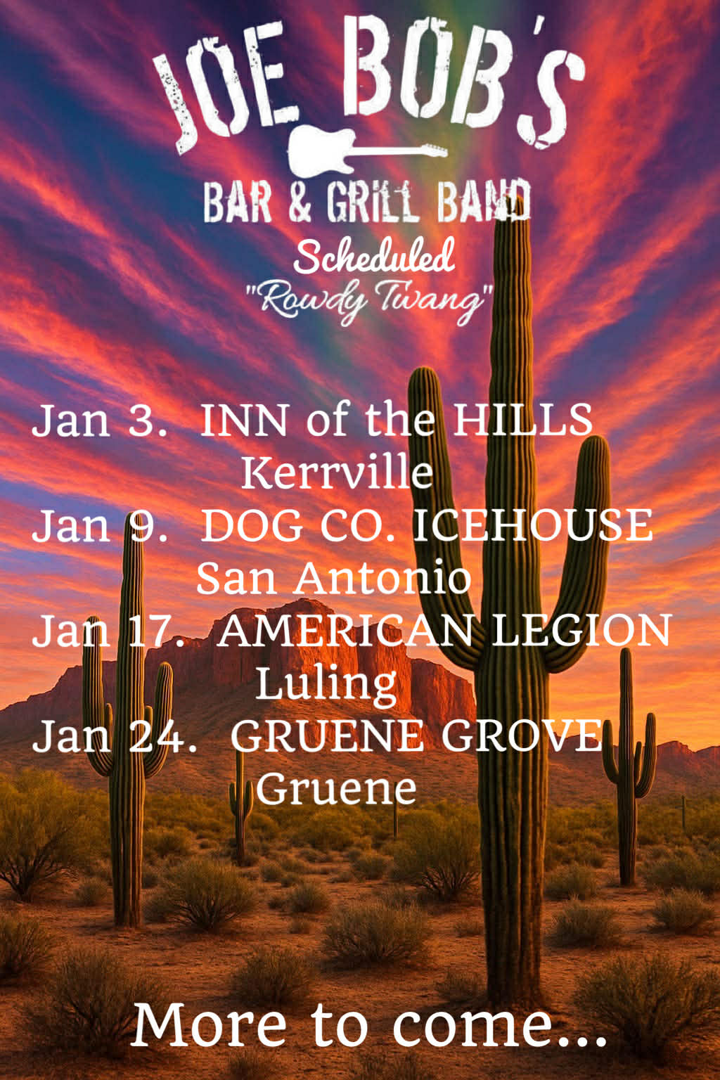 Joe Bob’s Bar & Grill Band is well known by country music lovers all over the state of Texas and beyond, performing what we refer to as “Rowdy Twang”.